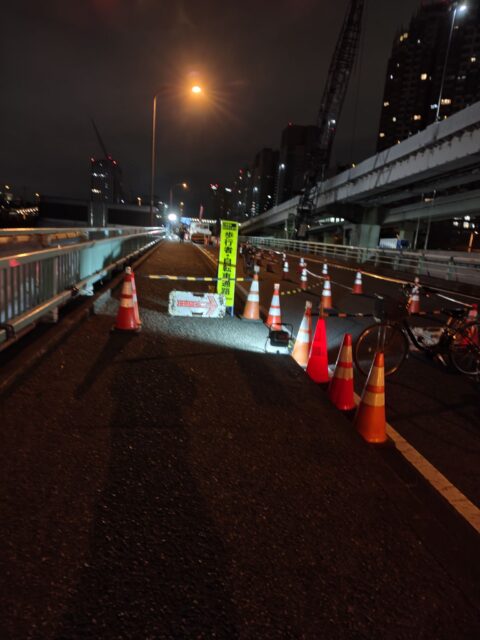 新年明けで最初の規制でしたので、手順を1つ1つミーティング時に再確認を行い怪我防止の為に準備運動を行い規制の設置を行いました。