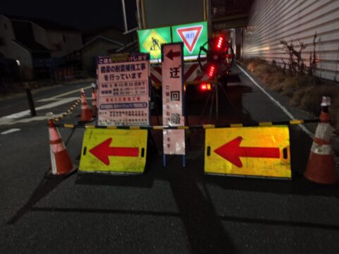 東京外環自動車道下の国道298線の走行車線規制と側道の通行止め規制を行いました。