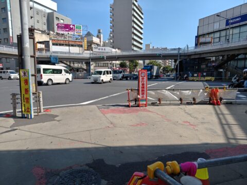 元ドン・キホーテとミスタードーナツの間の区間の歩道橋が開通になります。それに伴い横断歩道が8月30日に撤去になります。