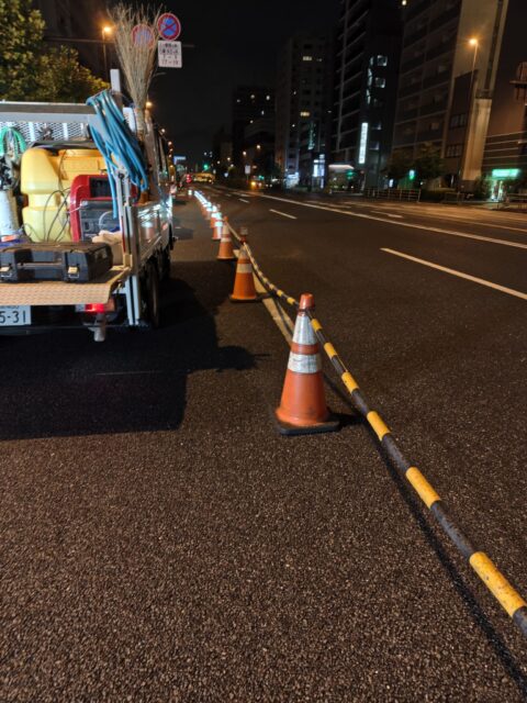 自転車通行帯の縁石復旧及びガードフェス復旧工程の為の規制を掛けています。