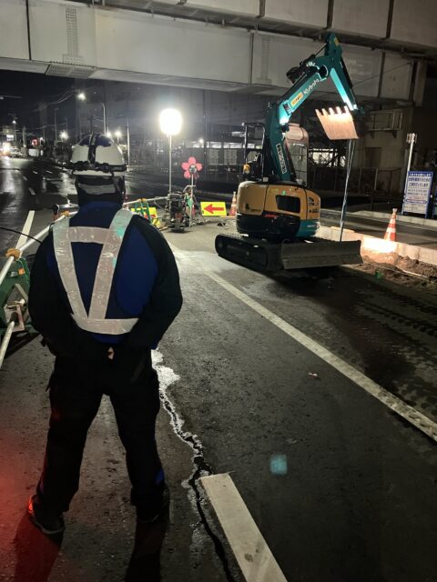 この週は途中から夜間規制もありまして、こちらは千葉県某所、車道掘削作業のための保安規制業務でした。
